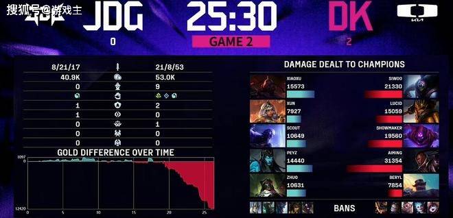 不出意外,两场比赛dk战队轻松碾压了jdg战队,第一局比赛前期jdg战队还有一些优势,但是中期的团战感觉就像乱玩一样,scout沙皇也是胡乱使用,感觉根本没有认真对待比赛,就像是在工作一样,能混就混。结果被dk战队打出了比较轻松的翻盘局,仅持续了32分钟就结束了第一局。第二局比赛更是惨烈,虽然开局六分钟scout果断先手禁锢,配合着xun击杀了Showmaker,甚至在中期还抢下了小龙,一度将经济拉扯得很死,结果在20分钟之后瞬间爆炸,短短四分钟的时间,经济差距就拉开了1万多,25分钟轻松推平JDG。