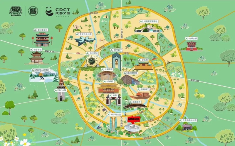 其中,旅游线邀您畅游宽窄巷子、、烟火锦江、双子塔、熊猫基地、杜甫草堂、西岭雪山、都江堰、青城山、金沙遗址、成都博物馆,在氤氲了2300年的人间烟火中去感受成都的“江山之雄,文物之盛”。