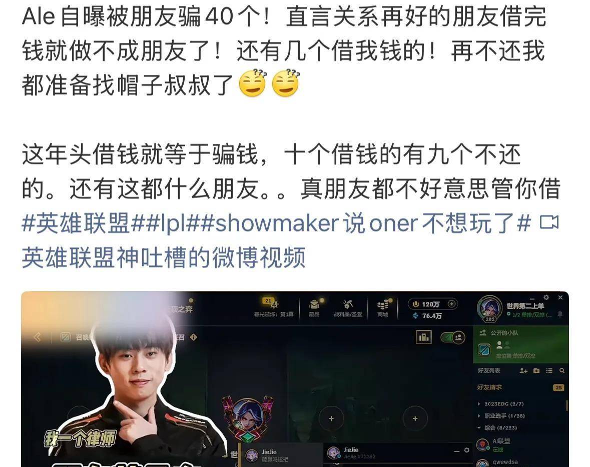 这话听起来有点绝对,但经历过的人可能都懂。Ale没细说这个朋友是谁,也没说这40万是怎么借出去的。有网友猜测,能借这么多钱不还,关系肯定不一般,说不定是女性朋友。但Ale后来又说,这事算了,不追究了。