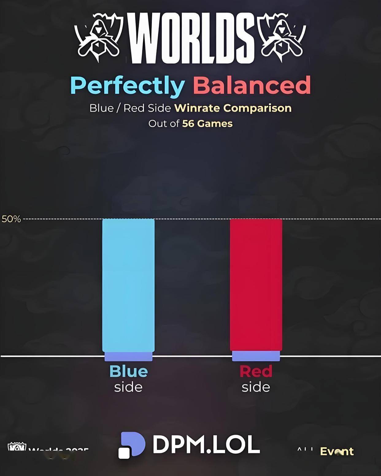 理由很简单,自从LOL在国服运行之后,红蓝双方的优势差距就非常明显,而且常年以来,几乎都是蓝色方占据优势,虽然在这次的英雄联盟世界赛上,56场比赛的红蓝双方胜率是50%,但除了职业比赛之外,在大多数玩家的眼里,蓝色方就是比红色方更占据优势,甚至这个差距,可以达到夸张的10% 以上