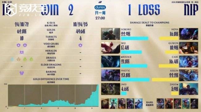 比赛伊始,Wei猴子联动Rookie瑞兹展现强大节奏力。河道逮捕Guwon赵信后,二人顺势转上,连续击杀Hoya奥恩,帮助iG迅速建立前期优势。进入中期,Jwei芮尔果断先手留人,Photic女枪完成击杀,iG打出1换2稳住节奏。随后Rookie瑞兹精准开车绕后,配合芮尔正面开团,Photic女枪大招火力全开完成收割,iG打出0换4并顺势控下大龙,经济领先来到7k。后期龙魂团iG处理得心应手,轻松1换3拿到电龙魂与第二条大龙,经济差扩大至9k。最终iG抱团推进上路,高地团战团灭NIP,一波推平基地先下一城。