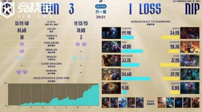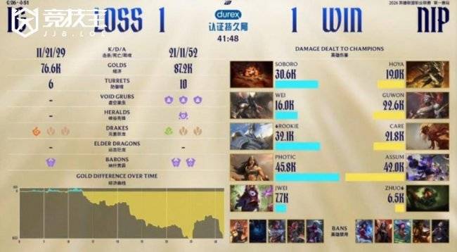 前期Guwon亚恒配合Zhuo泰坦下路成功抓到Photic希维尔,Assum芸阿娜拿下一血。随后Rookie加里奥及时支援,击杀Zhuo泰坦并收掉Assum芸阿娜还以颜色。上路HOYA鳄鱼单杀Soboro纳尔,之后Care岩雀配合队友再度针对纳尔,NIP顺势控下小龙。中期Care岩雀野区精准抬回Photic希维尔完成击杀,NIP放出先锋推掉中路一塔。随后Wei潘森在自家野区关键阵亡,NIP抓住机会拿下大龙并打出1换4,经济领先来到5k。后期NIP再收大龙,稳步推进将经济优势扩大至1w以上。关键下路团战中,Soboro纳尔神掌拍到两人击杀Assum芸阿娜,iG打出0换3并拿到小龙,将劣势缩小至5k。随后Photic希维尔双杀到手,帮助iG抢下大龙。然而最终中路决战NIP运营拉扯更胜一筹,击杀Soboro纳尔与Photic希维尔后打出0换4,一波推平iG基地,将比分扳为1-1。