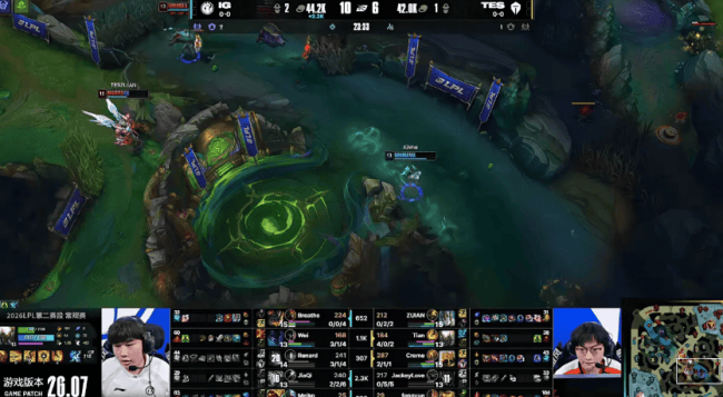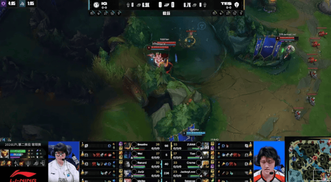 本场比赛,IG战队在蓝色方,TES战队在红色方。阵容方面,IG战队选择:Breathe奎桑提;Wei赵信;Renard阿萝拉;JiaQi芸阿娜;Meiko露露,TES战队则是:ZUIAN杰斯;Tian蝎子;Creme维克托;JackeyLove飞机;Fengyue娜美,本局比赛第8分钟,这就是奎桑提,Breathe奎桑提技能几乎全空但IG依旧完成0换2。10分钟,下路火力对拼IG占尽优势,JiaQi芸阿娜轻松拿下双杀。14分钟,Wei赵信伤害吃满开出大招,JackeyLove再次被秒随后比赛暂停!