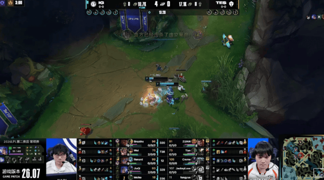 本场比赛,IG战队在蓝色方,TES战队在红色方。阵容方面,IG战队选择:Breathe兰博;Wei梦魇;Renard发条;JiaQi寒冰;Meiko萨勒芬妮,TES战队则是:ZUIAN加里奥;Tian潘森;Creme沙皇;JackeyLove烬;Fengyue巴德,本局比赛第3分钟,Tian与Fengyue变奏配合,出其不意坐门抓下击杀Meiko。7分钟,一步快步步快,Tian节奏起飞再次抓下配合队友击杀IG下路双人组!