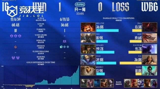 前期对线阶段,Renard蛇女被Xiaohu瑞兹抓住机会控住送出一血,不过Wei潘森迅速在中路反击,击杀探草的hang卡尔玛,随后转线下路配合Meiko巴德完成击杀,iG逐渐稳住局势。进入中期,小龙团Meiko巴德关键控制命中WBG野辅,iG顺势击杀建立优势。随后先锋团中,Renard蛇女闪现大招打出双杀,Breathe纳尔下路单杀Xiaohu瑞兹,iG节奏全面起势。尽管中期JiaQi出现失误被击杀,但WBG仅打出1换2,双方经济依旧胶着。后期团战iG处理更加细腻,连续在河道与中路打出优势团战,拿下大龙并拉开经济差距。Meiko巴德多次抓机会限制Xiaohu,iG再度打出0换4扩大领先。最终iG推进高地,一波结束比赛,先下一城。