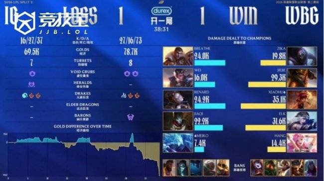 前期Wei赵信三级抓下,成功拿下Elk一血,iG开局顺利。随后下路2V2中,Meiko冰鸟完美封墙,配合JiaQi完成双杀,iG取得不错优势。但Xiaohu安妮连续支援上路,帮助队伍稳住局面。中期小龙团,Renard发条精准大招拉回Xiaohu,iG打出0换2继续扩大优势。但随后iG入侵野区时被WBG抓住机会,Zika贾克斯强势进场豪取三杀,WBG打出0换3成功扳回局势。比赛进入后期,双方中路持续拉扯。Wei赵信切入后排击飞Elk艾希,Breathe杰斯爆发击杀Xiaohu,iG一度冲上高地,但差一丝未能终结比赛。关键决战中,Zika贾克斯绕后切入,配合正面开团,WBG打出0换3,一波推进摧毁iG基地,将比分扳为1-1。