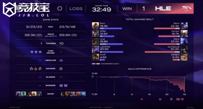 比赛前中期节奏较为平稳,双方以发育为主。22分钟小龙团成为转折点,HLE虽然丢掉小龙,但打出1换2的交换,随后迅速集结,在付出Kanavi潘森的代价后成功拿下大龙。进入中后期,HLE三核阵容逐渐成型,团战能力全面碾压。Kanavi潘森多次果断开团锁定LazyFeel芸阿娜,即便自身阵亡也为队友创造完美输出环境。Zeus薇恩、Zeka瑞兹以及Gumayusi女警轮番收割,KRX在团战中完全无法处理三核输出点,节节败退。最终HLE连续三波团灭KRX,顺利拿下首局比赛。