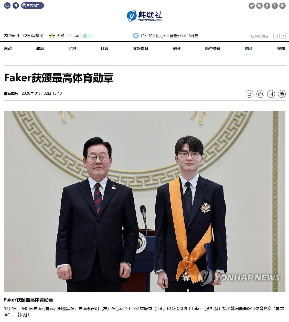 《英雄联盟》选手英雄联盟赛事官网- 官方网站- 投注网站Faker获韩国最高体育勋章“青龙章”