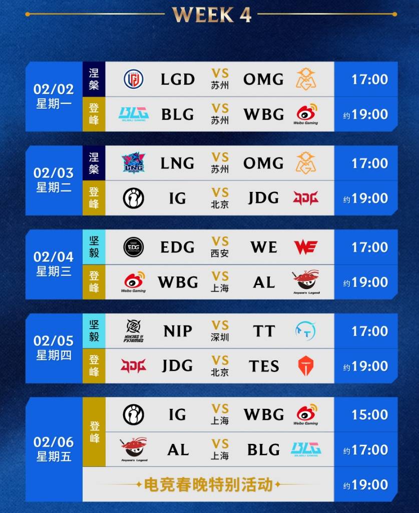 春晚大战是被安排在2月6日,有两场比赛,一场是IG打WBG,另一场是AL打BLG,都很有看点,值得期待。