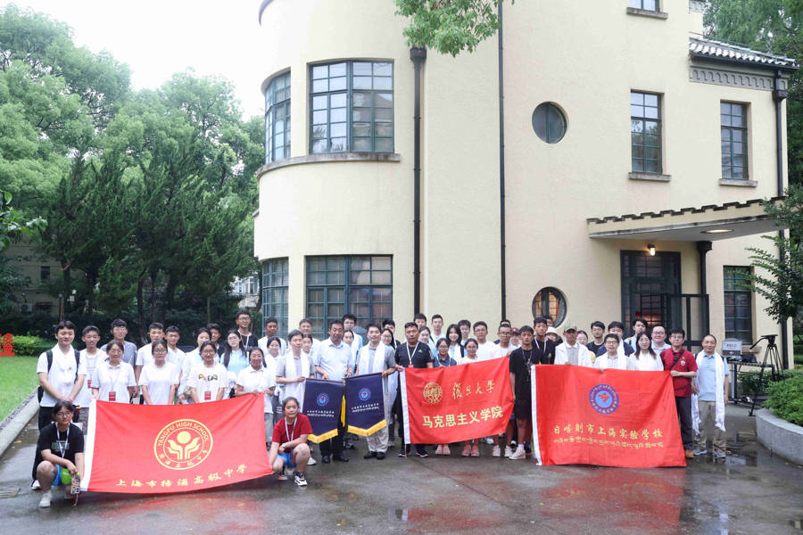日喀则市上海实验学校与杨浦高级中学、复旦大学师生代表在《宣言》展示馆合影留念。