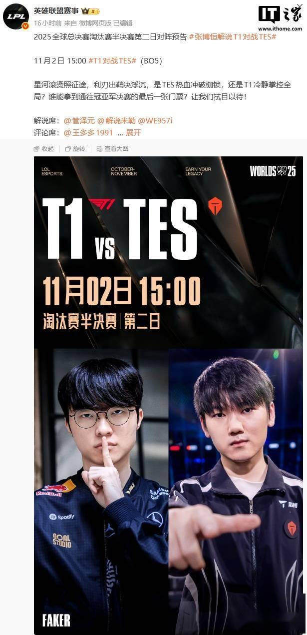 2025-11-05英雄联盟赛事官网,英雄联盟官方网站,英雄联盟投注网站IT之家 11 月 2 日消息,《英雄联盟》S15 全球总决赛今日迎来关键一战,本届赛事 LPL 赛区最后一支战队 TES 将在半决赛对阵 Faker 领衔的 LCK 四号种子 T1 战队,胜者将与韩国 KT 战队争夺今年 S 赛的总冠军。
